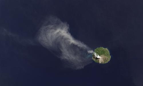 As the Landsat Data Continuity Mission satellite flew over Indonesia's Flores Sea April 29, it captured an image of Paluweh volcano spewing ash into the air.